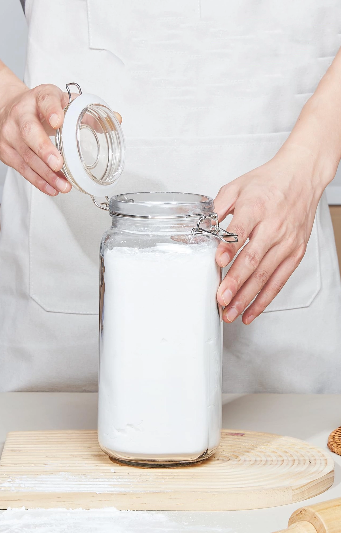 Large square glass canisters with airtight clamp lids, perfect for storing flour, cereal, coffee, pasta, and more. Includes 8 reusable chalkboard labels.