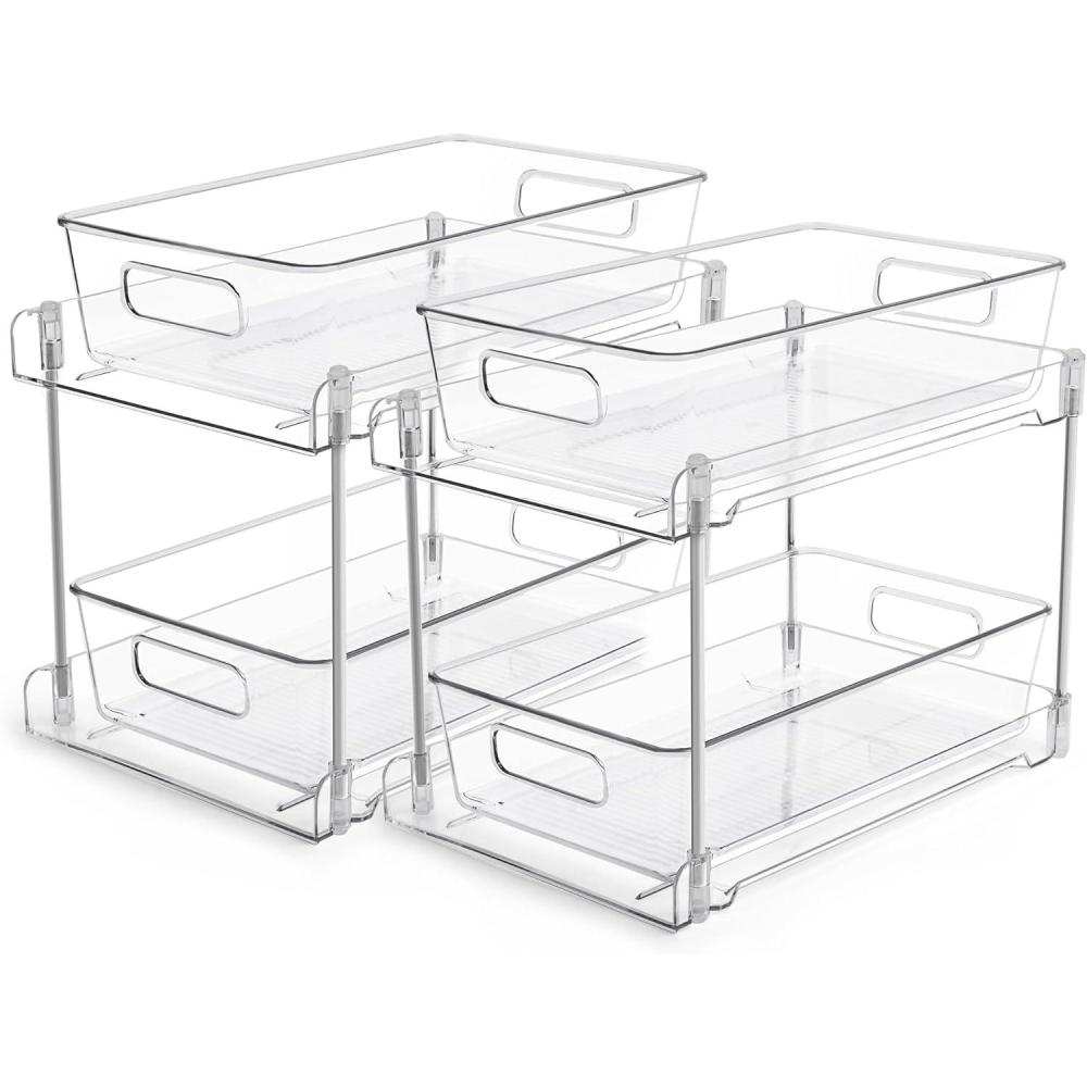 Vtopmart 4 Pack Bathroom Organizer, 2 Tier Clear Under Sink Organizers Vanity Countertop Storage Container,Cabinet Drawers Bins, Pull-Out Organization with Track for Pantry, Kitchen(Clear)
