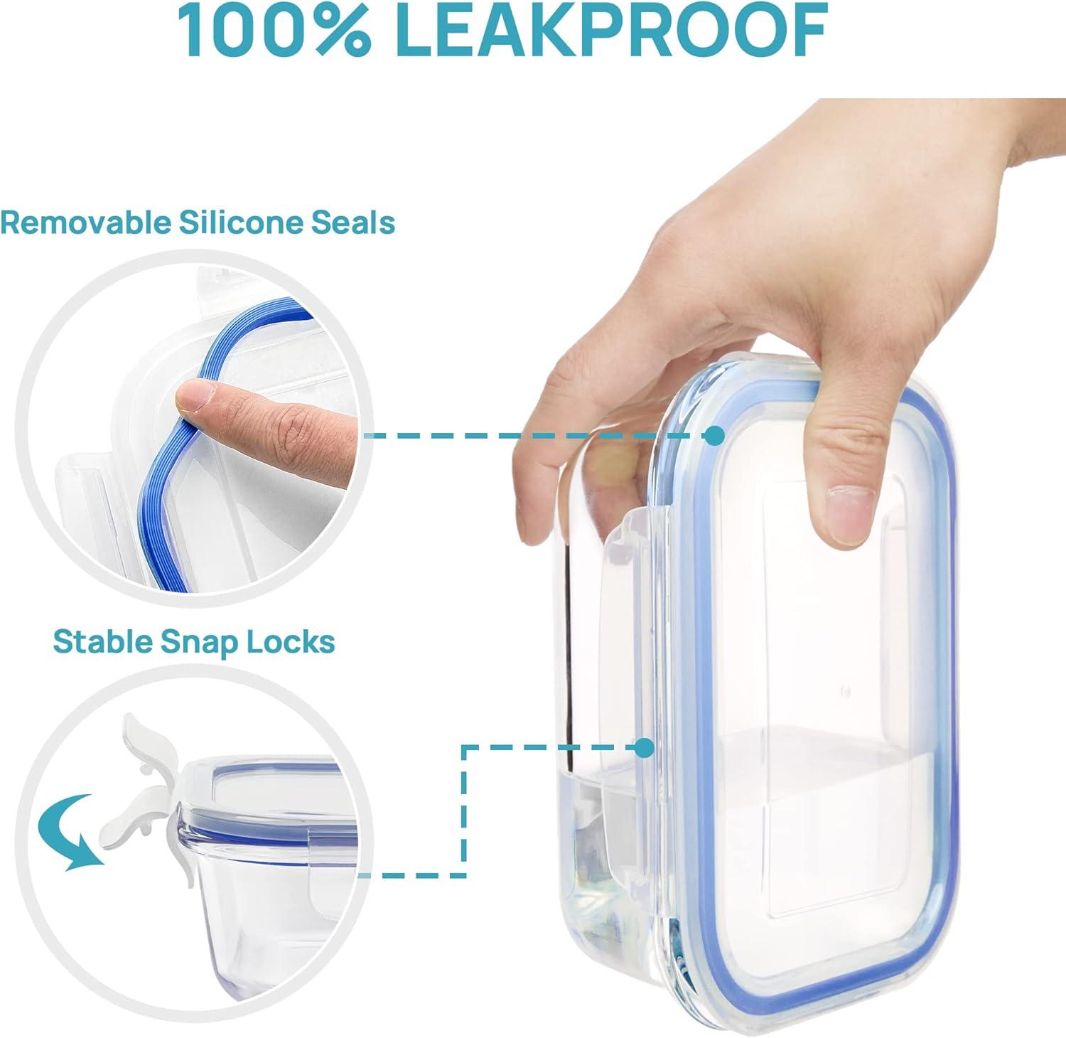 【100% Leak Proof Airtight Lid】Glass food containers is designed with removable silicone seals and 4-hinge snap locks to ensure zero leaking or spilling, which also prevent smell go out and keep food fresh.