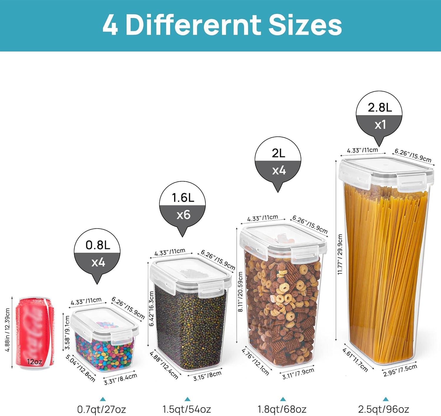 4 Size Combinations Fit Your Needs—-Our kitchen storage containers set comes in 4 different sizes. Includes 1 Tall Container (2.5quart/2.8 liters), 4 Large Containers (1.8quart/2.0 liters), 6 Medium Containers (1.5quart/1.6 liters), 4 Small Containers (0.7quart/0.8 liters). Perfect for storing spaghetti, baking supplies, cereal, flour, sugar, oats, pasta, rice, coffee, tea, snacks, nuts and other dry goods.