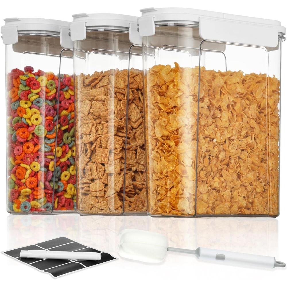 【Suitable Capacity & Versatility】: Reusable containers for cereal come with 3pcs 135.2oz/4L containers with extra gift with 8pcs blackboard labels and cleaning brush, perfect for storing dry goods, sugar, rice, nuts, beans, cereal, snacks, pet food, or anything else you may need to store.