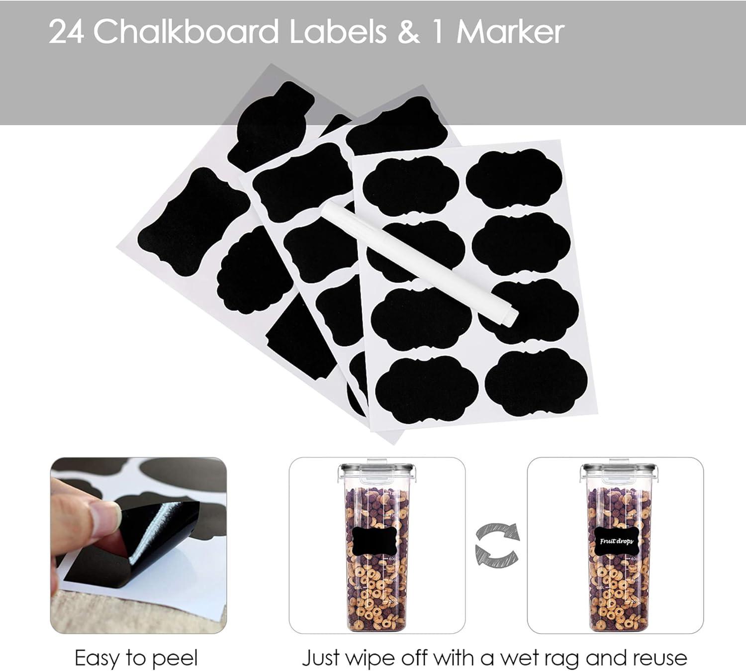 Come With Convenient Labels—-Except 4 food storage containers, you will also receive 24 pieces labels, which will help you never confuse flour with powdered sugar or baking powder with baking soda. They are reusable, you can switch contents whenever you need. Just wipe clean with a damp cloth to change what you have written, peel and Re-stick.