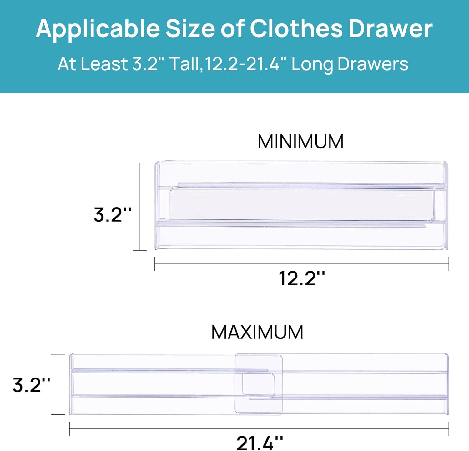 Apply for Drawer size bigger than 12.2L*12.2W*3.2H—-Both sides of the divider can be expanded outward, expandable from 12.2'' to 21.4', 3.2'' High. Please measure your drawer size before placing an order. The drawer dividers will help you organize your items and keep your drawers neat at all times.