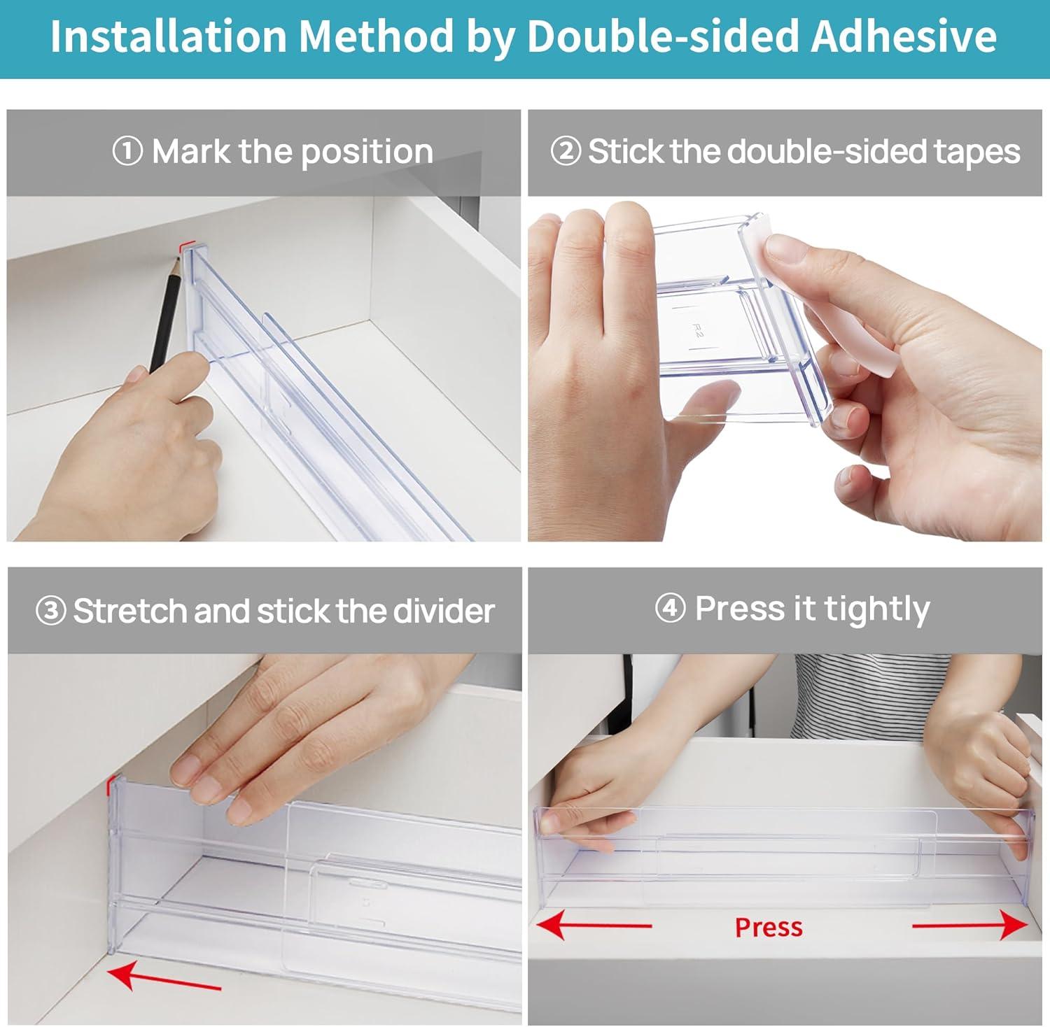 Double sided adhesive installation—- Compared to most drawer dividers with latches or built-in springs, it is quick and easy to install, no hardware or tools needed. Just glued the adhesive stickers(included) on the 2 ends of the divider,peel the white tapes, put it in the drawer, adjust to a suitable position,sticked the divider in the drawer,expand to the desired length and can be firmly held in place in drawers.